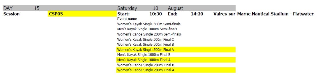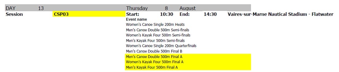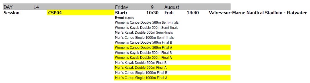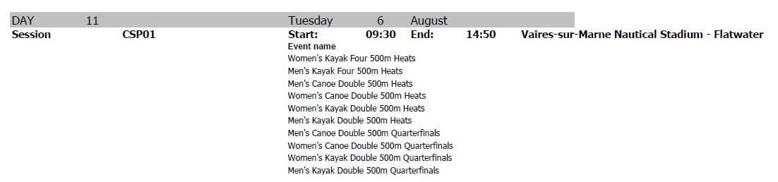 Bei der Disziplin Kanusprint Olympia werden 10 Wettbewerbe, 5 für Männer und 5 für Frauen ausgetragen.